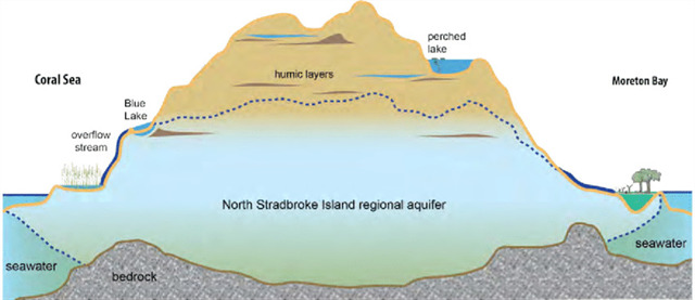 Rain falling on North Stradbroke Island recharges a massive aquifer of groundwater, estimated at between 800 and 1300 Giga litres or approximately 1.6 to 2.6 times the volume of Sydney Harbour. This aquifer forms a “central mound” or lens of freshwater in the permeable sand that forms the island.