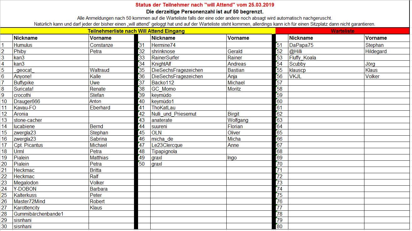 Ich würde dann in der Eventteilnehmerliste sowohl Cacher wir auch Vornamen aufnehmen und unter dem Event veröffentlichen. Ich würde mich freuen, wenn der Vorschlag bei euch ebenfalls auf Anklang finden würde.