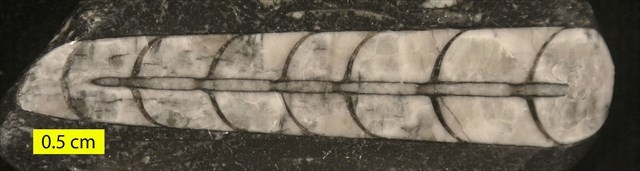 Orthoceras is een uitgestorven geslacht van mollusken, dat leefde tijdens het Midden-Ordovicium. Deze nautiloide koppotige had een taps toelopende, cilindrische, kegelvormige schelp met dicht opeenliggende kamers, die een hol en een bol septum (tussenschot) bevatten, met in het centrum een verbindende buis, de sipho. De orthoceras zijn weekdieren en konden van enkele centimeters tot 10 meter lang worden, het enige wat is versteend is achtergebleven is dus 'de wervel' van de inktvis.