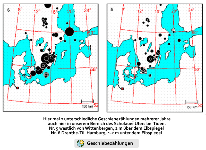 Es handelt sich bei dem ca. 1-2 m unter dem Elbespiegel frei liegenden Till (Grundmoräne) unterhalb von Tinsdal also um saalezeitliche, drenthestadiale Ablagerungen eines einzelnen Eisvorstoßes den man betreten und dabei viel über die Eigenschaften des Gletschertransportes lernen kann. Große und kleine kristalline und sedimentäre Geschiebe, insbesondere kleine Fossilien werden ständig durch die natürlichen, aber auch durch die von den großen Containerschiffen künstlich erzeugten Wellen freigelegt und es sind immer Überraschungen zu erwarten. Leider kümmert sich das aktuelle Niedrigwasser aber nur wenig um die Theorie des Tidenkalenders, denn wie tief das Wasser sinken wird, d.h. wie erfolgreich das Sammeln auf dieser fossilen Oberfläche der Saale-Vereisung sein kann, hängt primär von der Windrichtung ab. Ein ausbleibender NW-Wind genügt allein nicht. Vielmehr muss möglichst lange Ostwind herrschen. Von den Zeitangaben des Tidenkalenders für St. Pauli muss man in Schulau ca. 20 min abziehen. Die Tiden treffen dort schon früher ein. Bei günstigen Wetter-, Wind- und Mondbedingungen kann man erwarten, dass unterhalb der massiven Uferbefestigung ein ca. 30-40 m breiter und etwa 200 m langer Streifen des kalkreichen, hellgrauen Geschiebemergels frei liegt, auf dem man problemlos umhergehen kann. Dann bleiben dem Sammler 11/2 Stunde vor, bis 1/2 Stunde nach Niedrigwasser zum Betreten des Mergels. Es ist deutlich festzustellen, dass nach Erreichen des Tiefststandes der Strom sehr schnell seine Richtung umkehrt und der Pegel steil ansteigt. Innerhalb einer halben Stunde steht das Wasser schon wieder einen Meter höher und erobert sich diese kleine Fläche an Grundmoräne zurück.