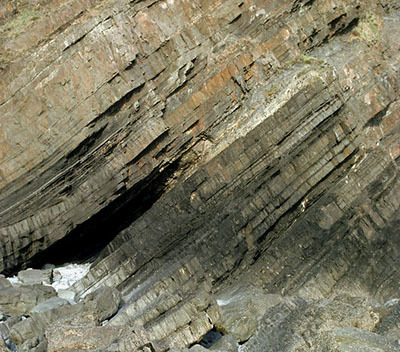 The sedimentary rocks you see before you here were deposited in a shallow sea during the Carboniferous period – about 320 million years ago. The layers are sequences of shales and mudstones representing the remains of sub-marine “avalanches” of sediments called turbidites. At the same time as the sands and mudstones were being deposited at Hartland, coals were being deposited in swamps, forming the South Wales coalfields.