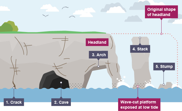 - Arch: again, over a period of time the cave becomes larger and eventually breaks through the headland to form an arch.