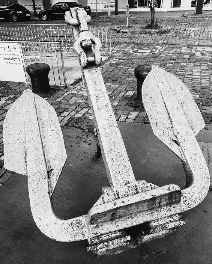 Neben diesem Anker befindet sich am Boden eine Steintafel mit Informationen.