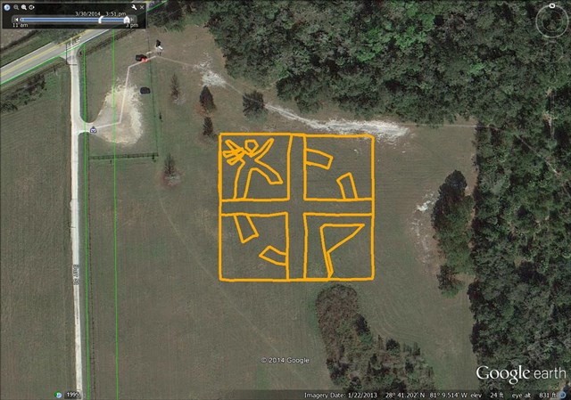 A suggested method for folks who want to draw geo-art: Sketch out your preferred image in Google Earth first, then save it as a tracklog. Then open that tracklog in Basecamp, and transfer the tracklog to your GPS. Then, as you wander around the field, you can "trace" your existing lines, and hopefully get a good image out of it. I plan on bringing my laptop, so we can upload your tracklog as pictures, to the cache page. This is commonly referred to as the BBear Method.