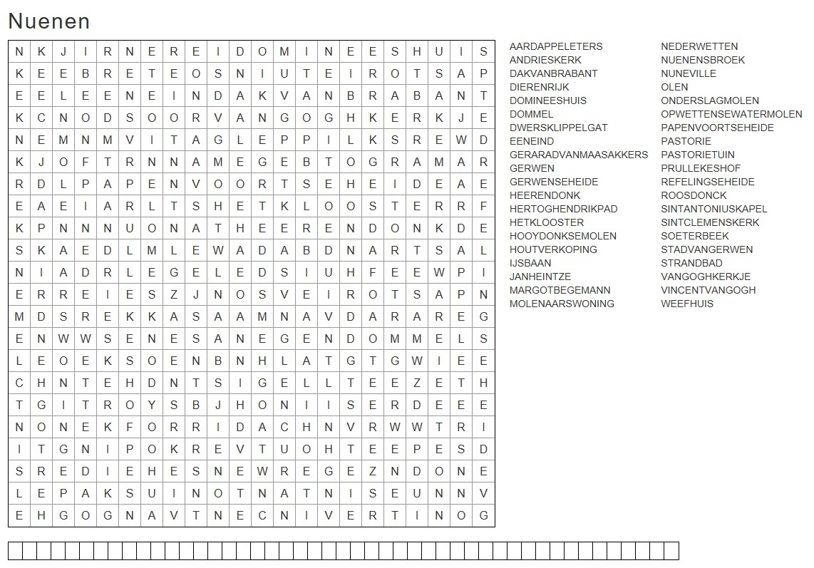 Soms is het fijn om een puzzeltje op te lossen, gewoon als tijdsverdrijf. Ik maak zelf graag legpuzzels en woordzoekers. En wat is er leuker dan twee van mijn hobby's te combineren? Zo ontstond deze geocache. Veel puzzelplezier!