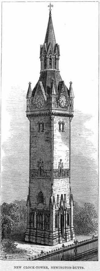 The Newington Butts Road became busier and busier and as the church stood so close to the road, it was considered a public danger. In 1876, the church was demolished and a new one built in Kennington Park Road. The old churchyard became a public garden and a year later, on the site of the old church, a new clock tower was erected which is described by Edward Walford: