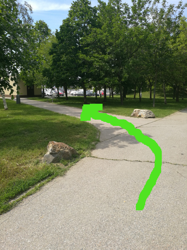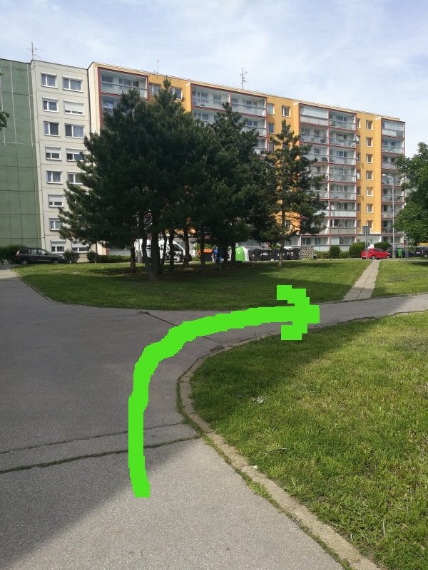 Pokracujte v ceste a zahnete ve smeru sipky, prejdite silnici a najdete objekt.