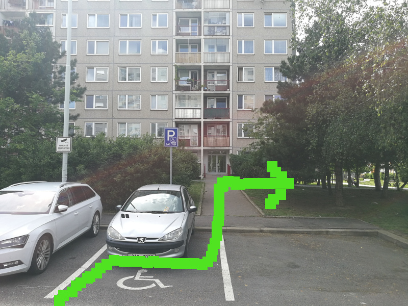 Pokracujte v ceste a zahnete ve smeru sipky. Cislo rohoveho parkovaciho mista je E.