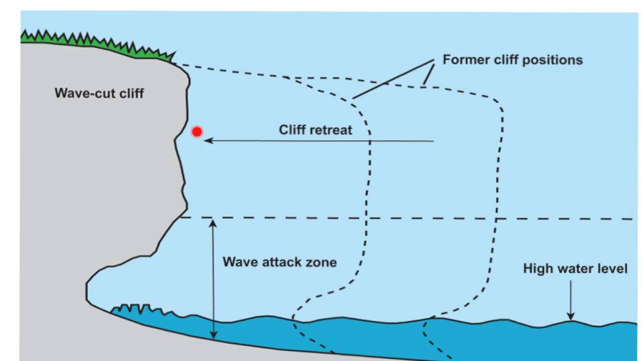 Coastal erosion is typically driven by the action of waves and currents, but also by mass wasting processes on slopes, and subsidence (particularly on muddy coasts). Significant episodes of coastal erosion are often associated with extreme weather events (coastal storms, surge and flooding). On coastal headlands, such processes can lead to undercutting of cliffs and steep slopes and contribute to mass wasting. Coastal erosion is a natural process which occurs whenever the transport of material away from the shoreline is not balanced by new material being deposited onto the shoreline. Many coastal landforms naturally undergo quasi-periodic cycles of erosion and accretion on time-scales of days to years. This is especially evident on sandy landforms such as beaches, dunes, and intermittently closed and open lagoon entrances. Natural erosion can cause the formation of caverns, such as that at the posted coordinates.