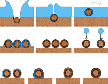Pisolites have formed by chemical precipitation. Essentially a nucleus enveloped by irregular layers in a spherical form. Typically composed of iron, aluminium and manganese oxides with minor amounts of quartz and clay, they are widely distributed in tropical to subtropical regions overlying deeply weathered soil profiles. Their formation has never been observed or produced experimentally and current models for their origin are little more than geologist guesses. Pisolites have been observed in Martian soils and are considered evidence of a once wet Mars. One theory is that pisoliths are formed by rain drops during rainfall on a fine mineral sand.