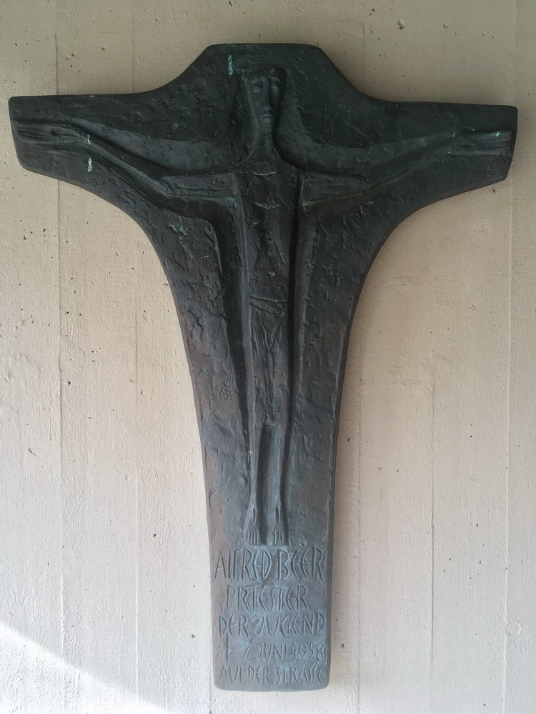 Teile der Glasfenster, das steinerne Weihwasserbecken, das Glöcklein (visit link) aus dem Jahre 1730 und das große, gut restaurierte Altar-Votivbild der »Vierzehn Nothelfer« (visit link). Es bildet im mystischen Innenraum (visit link) den sakralen Mittelpunkt. Auch der hl. Wendelin (visit link) bekam in der Kapelle einen neuen Platz. In die Außenanlagen zur Kapelle wurden die bereits erwähnten alten Feldsteine (Sühnekreuze) (visit link) und die kunstvolle, steinerne Pieta (visit link) aus dem Jahre 1732 - gestiftet von Anna Barbara Rheinboldin - eingebaut. Links vor dem Eingang zur Kapelle - geschützt durch den gedeckten Vorraum - befindet sich das Gedenkkreuz für den auf der Bundesstraße 3 beim alten Standort der St. Antoniuskapelle am 07. Juni 1958 tödlich verunglückten Diözesan Jugendpfarrer Alfred Beer. (visit link)