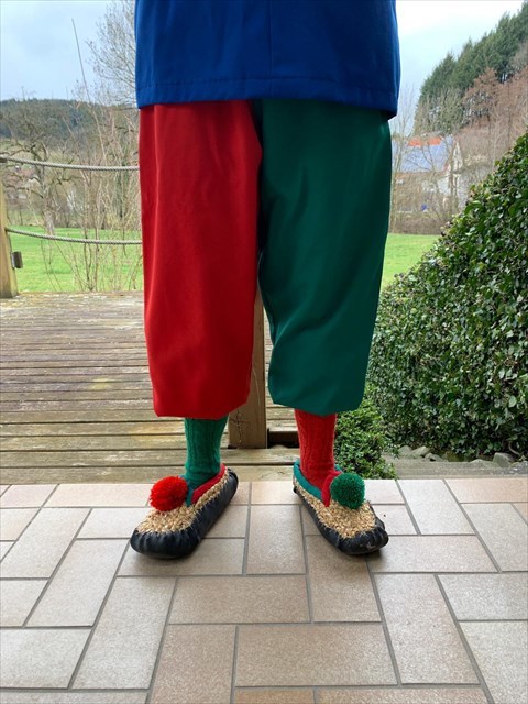 Als Hose trägt der Spitzbue die damals übliche Überfallhose. Bei der Überfallhose handelt es sich um eine Hose, deren Beine lang und weit genug sind, dass sie noch etwas über den fest anliegenden Bund fallen. Ihren Namen verdankt sie dem Überfall, bzw. dem überfallenden Bereich der Hose, welcher ihren Bund verdeckt. Auch Hosen ohne eingenähten Bund können als Überfallhose getragen werden. So wird in der Bundeswehr die Feldhose als Überfallhose getragen, indem die Hosenbeine umgeschlagen und innen mit einem Gummiband an der Wade befestigt werden. Überfallhosen sollen verhindern, dass die Hosenbeine auf den Boden reichen, wo sie Schmutz oder Nässe aufnehmen könnten, und gleichzeitig durch Verdecken des Bundes ein besseres Aussehen sicherstellen. Außerdem wird durch den engen Abschluss eine bessere Wärmeisolation und ein Schutz der Beine vor Insekten ermöglicht.