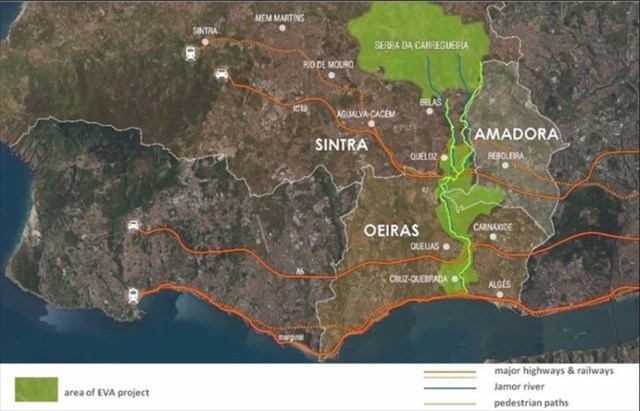 O "Eixo Verde e Azul", também conhecido por EVA, é um projeto que pretende fazer um corredor verde com ciclovias e caminhos pedestres seguindo a ribeira de Carenque e o rio Jamor desde a nascente na serra da Carregueira, atravessando Belas e Queluz até ao rio Tejo à foz na Cruz Quebrada.