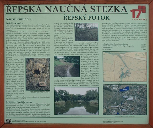 Revitalizace Řepského potoka tak symbolicky navrací vodu do Řep a zároveň zajišťuje dostatek vody pro poslední řepský rybník Prasečák. Vodou je Řepský potok je napájen z jezera Hliník. Přebytečná voda z jezera totiž až do 04/2014 (dokončení revitalizace) odtékala dešťovou kanalizací do čistírny odpadních vod Klio a odtud pak do Zličínského potoka.