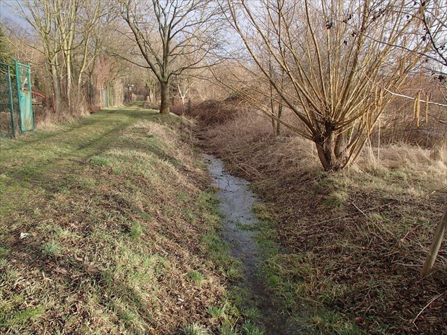 Jak jsem již uvedl, potok je napájen vodou z jezera Hliník odkud je svedena pod železniční trať a ulici Na Chobotě do prostoru nad Penny Marketem. Tam se potok poprvé objeví na povrchu a jako malý přírodní potůček teče pruhem zeleně pod sídlištěm až k Penny Marketu, kde opět zmizí v zatrubnění. Dále se potok objevuje těsně nad rybníkem Prasečák a odtamtud teče již původním korytem až k Pražskému okruhu, kde opět mizí v dešťové kanalizaci a odtéká do Litovického potoka. Následně vtéká do retenční nádrže Jiviny. Podél potoka je vybudováno několik malých tůněk a otevřené koryto potoka je osázeno vegetací.