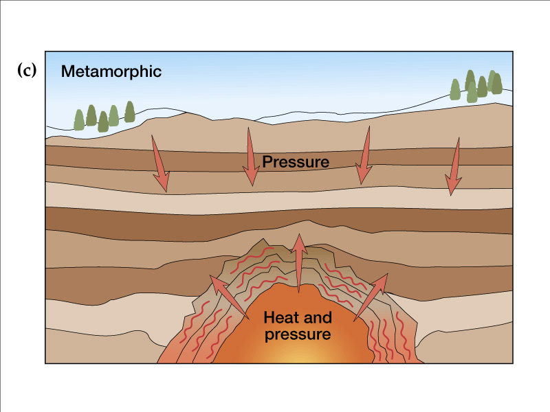 regional metamorphism. Some marble also forms by contact metamorphism when a hot magma body heats adjacent limestone or dolostone. During metamorphism, the calcite recrystallizes and the texture of the rock changes. In the early stages of the limestone-to-marble transformation, the calcite crystals in the rock are very small. In a freshly-broken hand specimen, they might only be recognized as a sugary sparkle of light reflecting from their tiny cleavage faces when the rock is played in the light.