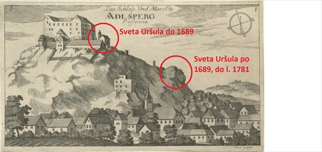 - The church of St. Uršula first stood near the Postojna castle (german: Adelsberg) on Sovič (visible on the lithograph of Janez Vajkard Valvasor from 1689). The castle is first mentioned in 1251, although its beginnings date back to the 12th century. The castle was hit by an earthquake in 1511. The church was first mentioned in 1598 and in 1659 it was renovated. It was abandoned after 1689.