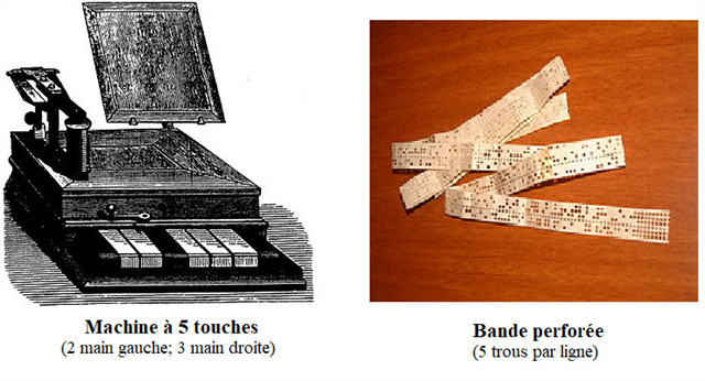 1901 : modification du code Baudot par Donald Murray = l'Alphabet International (AI n°2) et naissance du téléscripteur avec clavier de machine à écrire à 5 touches et bande perforée.