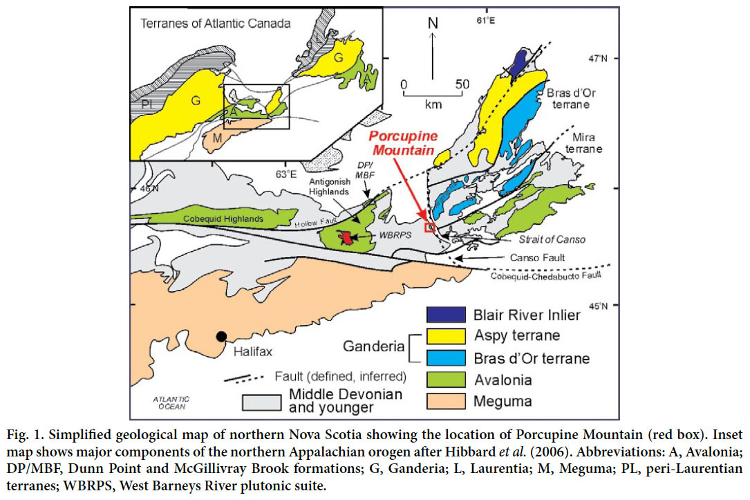 The Antigonish Highlands of northern mainland Nova Scotia and the Mira terrane of southern Cape Breton Island are both part of Avalonia, characterized by Neoproterozoic volcanic, sedimentary, and plutonic rocks overlain by Cambrian-Ordovician mainly sedimentary rocks. (The Cape Porcupine Complex, northern mainland Nova Scotia – no longer a geological orphan. S. M. Barr, C. E. White, J. W.F. Ketchum, 2012.)