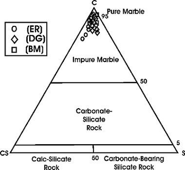 Il calcare marmoreo o cristallino è una roccia convertita composta per il 95% da cristalli di carbonato, più comunemente di calcite (CaCO3). Il restante 5% forma vari silicati, argilla, limonite, grafite e altri minerali e sostanze organiche che macchiano il marmo bianco.