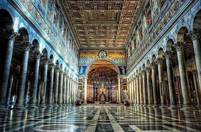 The Basilica of St. Paul is magnificent, with enormous marble columns and beautiful gold mosaics. Unfortunately, because of the fire of 1823, few parts of the Medieval basilica remain intact. However, the church still houses some mosaics from the thirteenth century, a large twelfth-century chandelier, or the marble tombstone under which the remains of St. Paul lie.