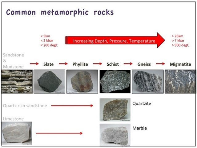 Il marmo può essere creato dalla regione, ma raramente anche la trasformazione del contatto (le cosiddette biglie di contatto) dei calcari depositati (probabilmente dolomite, magnesite o siderite). Può anche essere una metamorfosi del marmo più vecchio. Questo processo causa una completa ricristallizzazione della roccia o del minerale originale. La temperatura e la pressione di solito distruggono tutti i sedimenti nella roccia originale. Il marmo bianco puro era una metamorfosi di calcare purissimo.