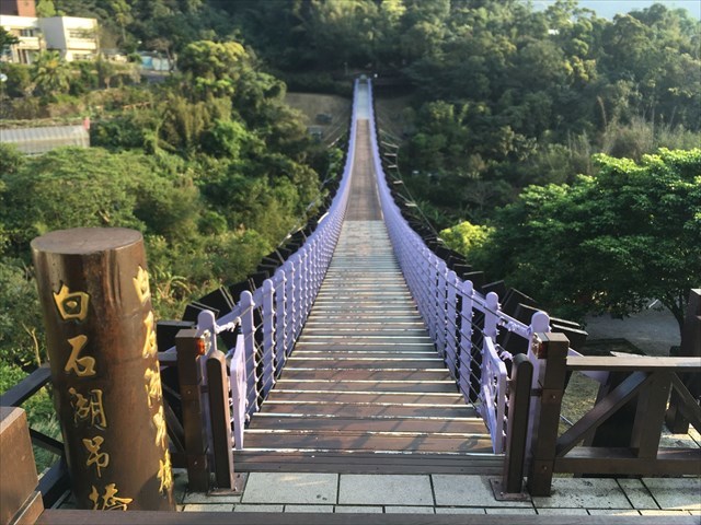 As part of the Baishihu Leisure Agricultural Area in Neihu, Taipei City, the 116-meter Baishihu Suspension Bridge spans the Zhongyong and Daluntou mountain systems, and is accessible from the entrance by the parking lot of Bishan (Kaichang Shengwang) Temple. The keel-inspired bridge stretches from the Dragon Boat Rock in the east to Yuanjue Waterfall in the west, connecting four mountains (Baishihu, Daluntou, Zhongyong and Liyu) along the way as if it were a gigantic dragon watching over the scenic Baishihu.