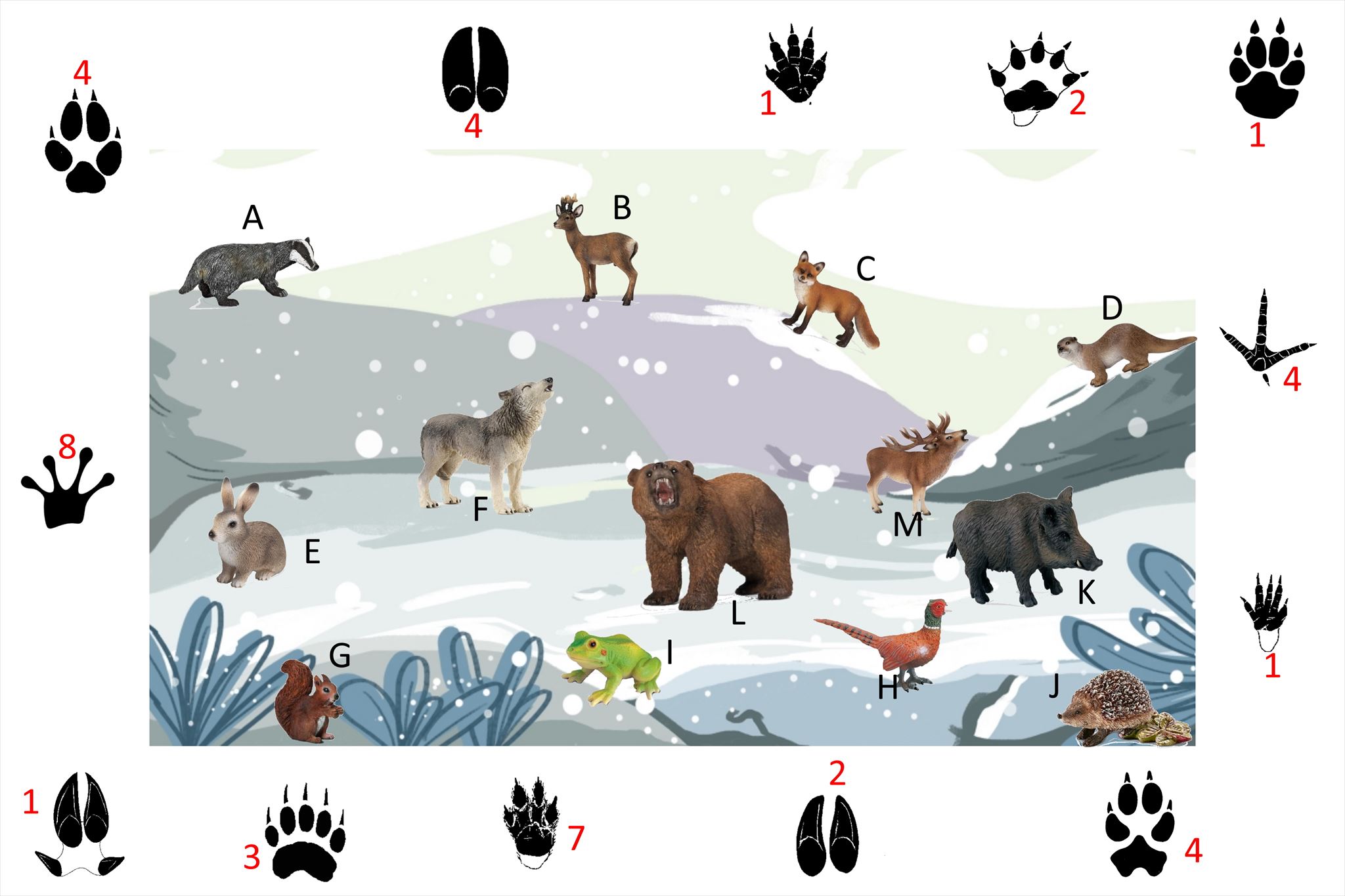 La forme laissée par la patte de l’animal et la taille de cette empreinte sont des indices principaux. En général, les empreintes apparaissent nettement sur les sentiers de terre après la pluie ou dans la neige, puisque l’extrémité des pattes s’y moule parfaitement.
