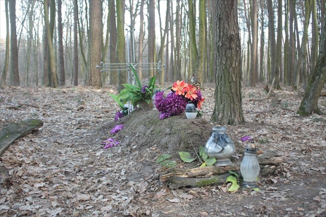 Today, the outline of the grave is marked only by wooden logs arranged in the rectangle and the grave almost merges with its surroundings. The only characteristic sign is a metal cross and candles. Grave is being taken care by locals and school in Zemborzyce.