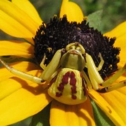 The spider species Misumenoides formosipes, commonly known as White-banded Crab Spider, belongs to the genus Misumenoides, in the family Thomisidae. This is one of the few spiders in North America that are capable of actively changing their body color from yellow to white, or vice versa, depending on the flower they are perched on. They do this by transferring a liquid, pigmented material to the cuticle. The color change is not instantaneous; it can take anywhere from three to nine days to complete.