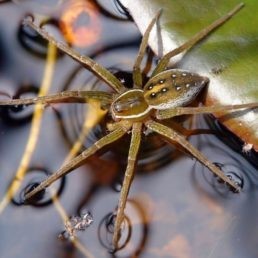 The spider species Dolomedes triton, commonly known as Six-spotted Fishing Spider, belongs to the genus Dolomedes, in the family Pisauridae. This spider can dive below the surface of the water when escaping predators or trying to catch food. They can stay underwater for up to an hour. Feeds on prey as large as minnows and frogs, etc. Like other fishing spiders, they also actively propel themselves across the water surface by rowing and galloping.