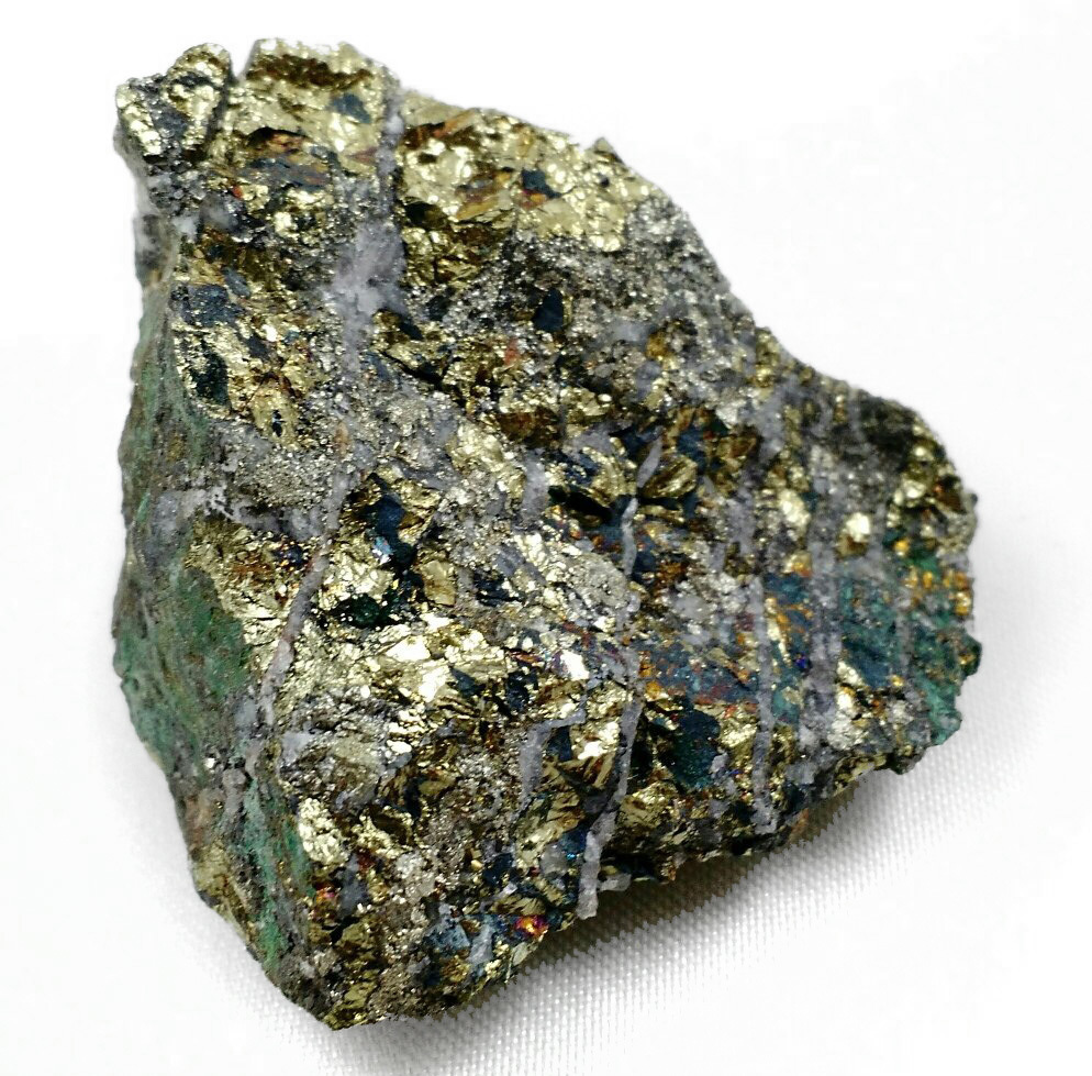 La calcopirita es un mineral que se presenta en la naturaleza como un disulfuro de hierro y de cobre. La fórmula química de este mineral es: CuFeS2, es decir, una combinación de hierro (Fe), cobre (Cu) y azufre (S). También denominada “pirita del cobre”, es un mineral que pertenece al sistema tetragonal y se encuentra clasificada dentro de los sulfuros dada la importante presencia de azufre. Se trata de un mineral semi-pesado, muy poco duro y frágil que se caracteriza sobre todo porque tiene un brillo metálico y cuando arde emite luces verdes por la presencia de cobre, así como emana vapores tóxicos, por lo que hay que tener cuidado al manipularla. La calcopirita es uno de los sulfuros más comunes e importantes, se encuentra en todo el mundo y constituye por ello la principal mena de cobre.