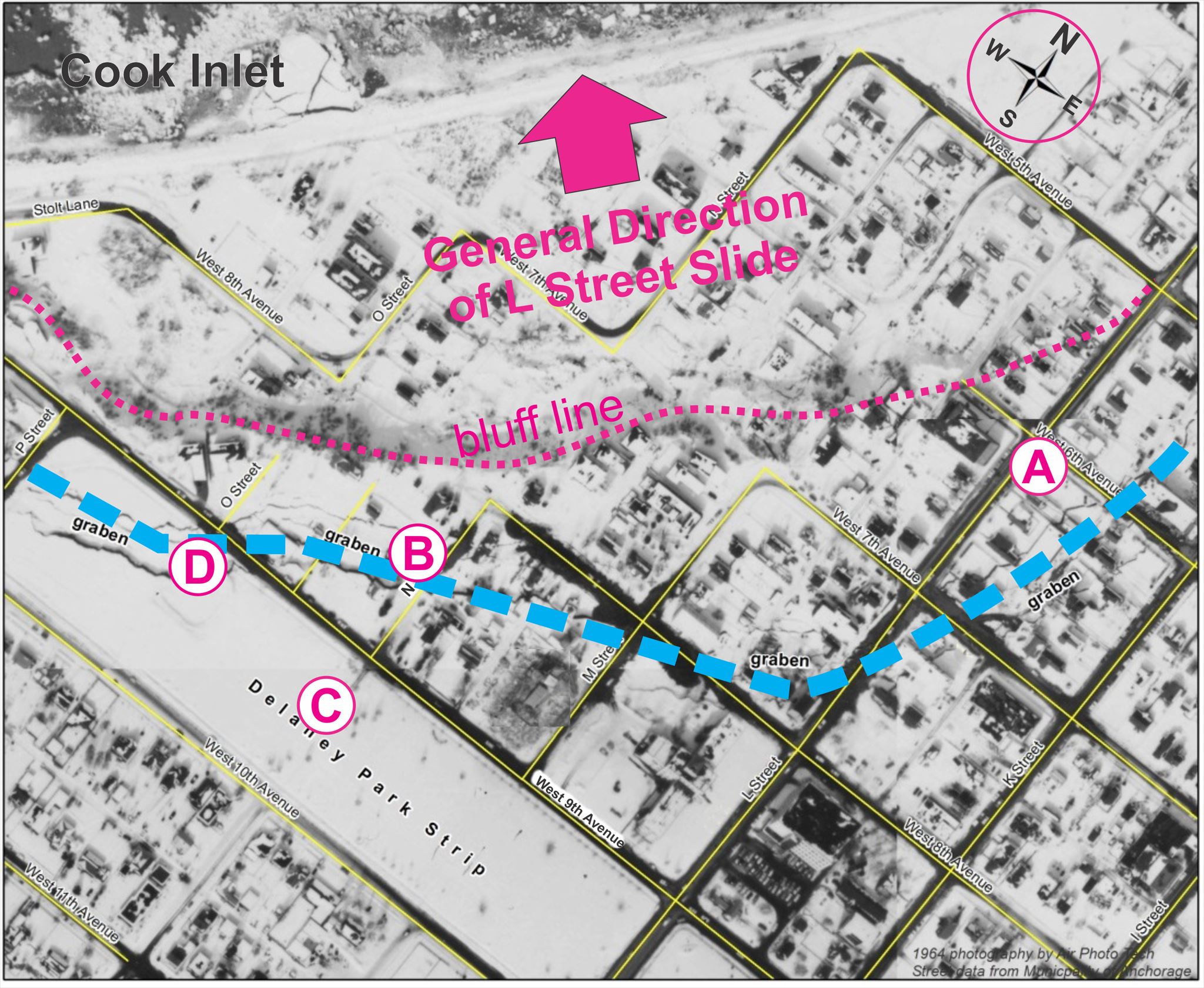 A 30-block area was affected in the L Street slide. It extended northeast about 4,800 feet along the bluff, and had a maximum breadth northwest across the bluff of about 1,200 feet. It reached about a block and a half back from the bluff into thickly-settled residential and commercial neighborhoods of downtown northwest Anchorage. Despite lateral shifting of as much as 14 feet towards the northwest, remarkably little damage occurred, with most damage happening along the edges of the graben itself. The slide included the land west of K Street between Seventh and Third Avenues, and land northwest of a line from the intersection of K Street and Seventh Avenue to the intersection of S Street and Eleventh Avenue. The map below is overlaid on a 1964 aerial photo taken several days after the earthquake by Air Photo Tech, with the northwesternmost bluff line highlighted with a dashed magenta line and the graben highlighted with a broad dashed blue line. The bluff is still easily observable transecting the neighborhoods between Third Avenue and L Street all the way down to Thirteenth Avenue and S Street. However, it can be extremely challenging for uninformed visitors to find any evidence of the graben’s shapeform today across this neighborhood. At each location you visit, you’ll see how the city was reconstructed following the earthquake to make the graben virtually indistinguishable from surrounding terrain. Nonetheless, there are still discernible signs of the massive slide that occurred here, if you correlate the photos shown in this description with observations you'll make at these four points.