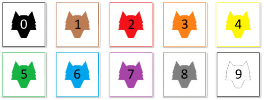 Om de waardes voor A t.e.m. F te kunnen invullen, vind je in elke cache (behalve #6) een gekleurd wolvenlogo met daarin een letter. Bij elke kleur hoort een cijfer tussen 0 en 9.