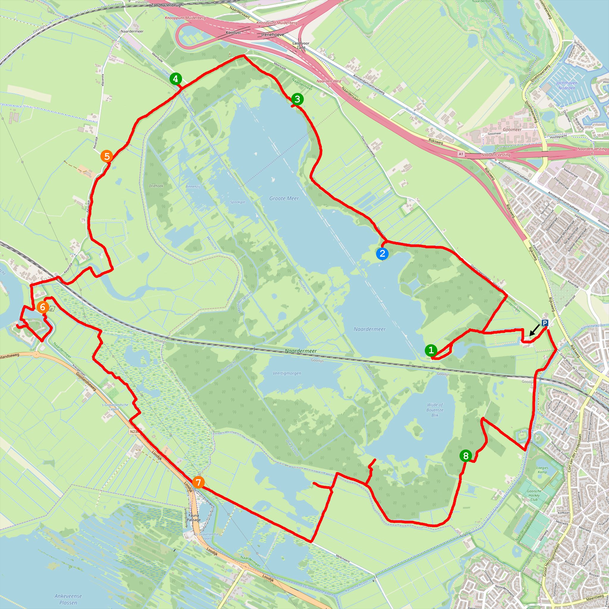 De serie 'Rondje Naardermeer' volgt de wandelroute van Natuurmonumenten. Deze is in totaal bijna 20 km lang en gemarkeerd met blauwe pijltjes.