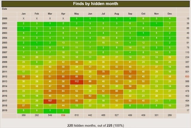 Um hier die Berechtigung für den Log zu erhalten, müsst Ihr nachweisen, dass Ihr seit Mai 2000 bis zum Monat eures Funddatums dieser Challenge aus jedem Versteckmonat mindestens einen Cache gefunden habt.