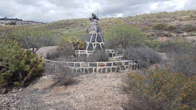 Monumento realizado con callados (Piedras del mar) cerca y por debajo se encuentra un enorme pozo de agua, el pozo se encuentra tapado. Mirando hacia la salida del Sol veremos unas ruinas de una casa antigua, si miramos hacia la Montaña de Guaza, observamos una casa en buenas condiciones, esa casa se encuentra abandonada.