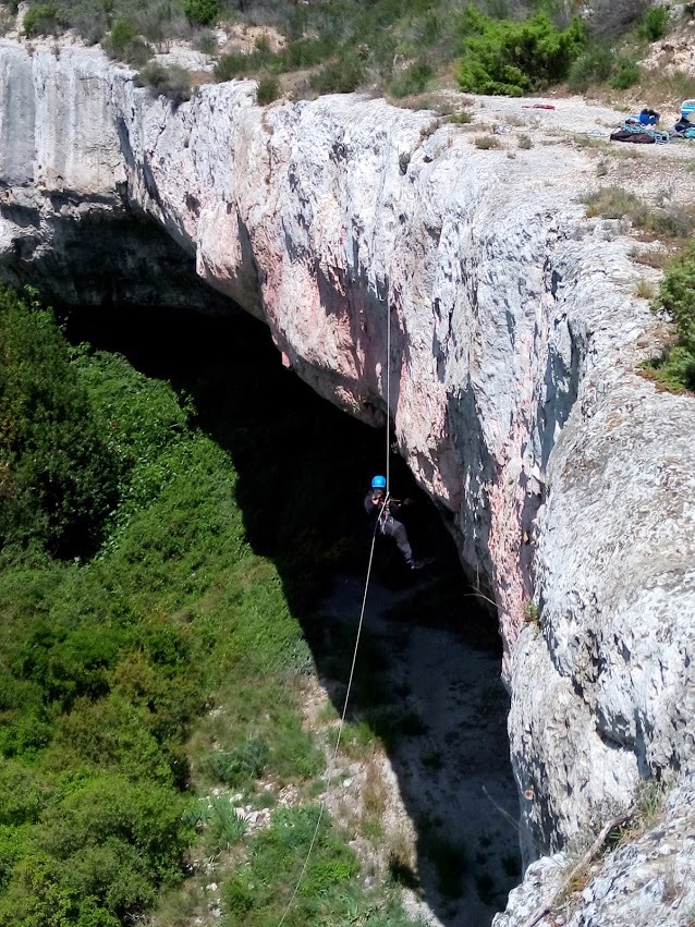 La cache est située dans la Baume Canouille. Pour l'atteindre il faudra effectuer un rappel en fil d'araignée. Utiliser le relais sommital le plus à droite en regardant en bas (voir photo). Comme la cache n'est pas exactement dans l'axe, il peut être utile de faire un fractionnement sur le 1er point en descendant. La cache est fixé sur un relais en paroi muni d'une chaîne. Après avoir loggué vous pouvez soit continuer la descente au sol, il y a un chemin qui permet de remonter à pieds soit remonter au jumar mais dans ce cas le fractio est obligatoire pour éviter les frottements à l'angle du haut.