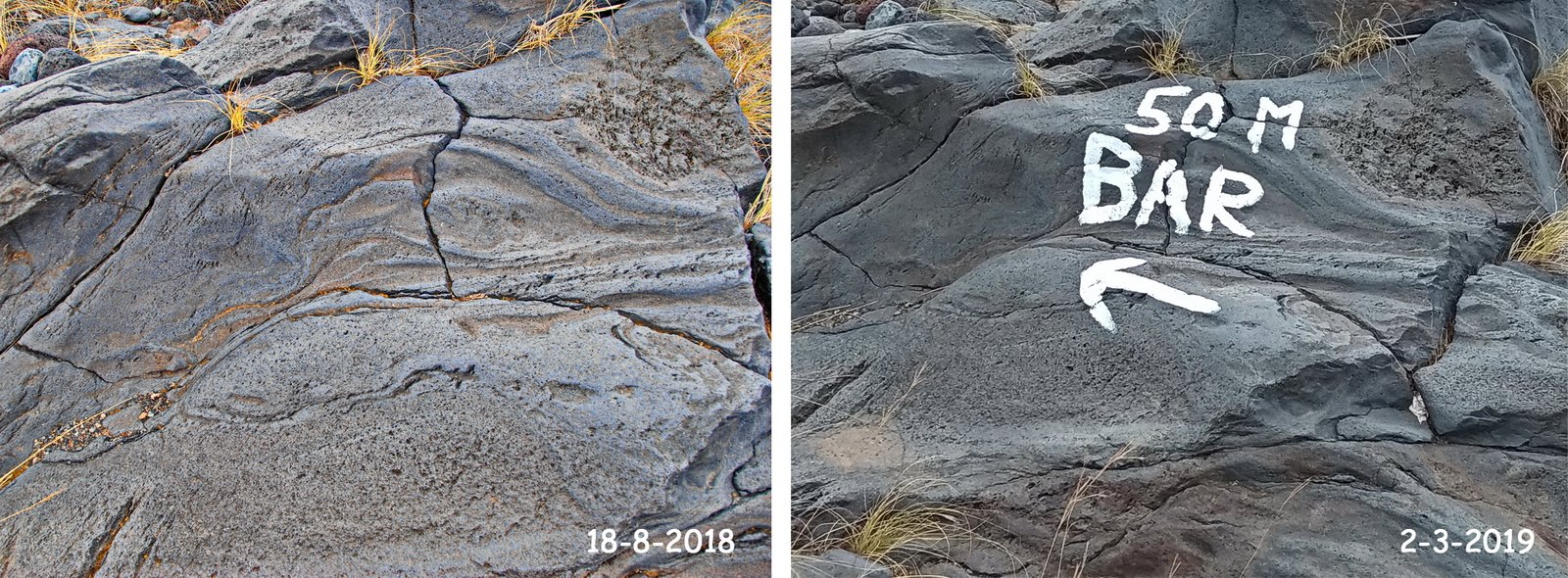 Mi primera intención era colocar el cache en el cauce del barranco, pero un poco más abajo, cerca de una roca con un grabado que me recordaba “El ojo de Osiris”, pues había localizado el lugar en agosto de 2018. Pero cual fue mi sorpresa al comprobar lo que algún “homo rebencus” había realizado en el lugar, una pintada en la piedra indicando la situación de un bar. Desgraciadamente no es el único lugar donde han realizado “grafitis” de este tipo. Por supuesto que no pienso ir a ese bar a tomar ni un café. ¿Qué les costaba colocar un cartel y no deteriorar el medio ambiente? Esto lo hace en su país de origen y lo mismo le meten una buena sanción. Por desgracia no es el único lugar donde estos individuos han realizado “grafitis” de este tipo.