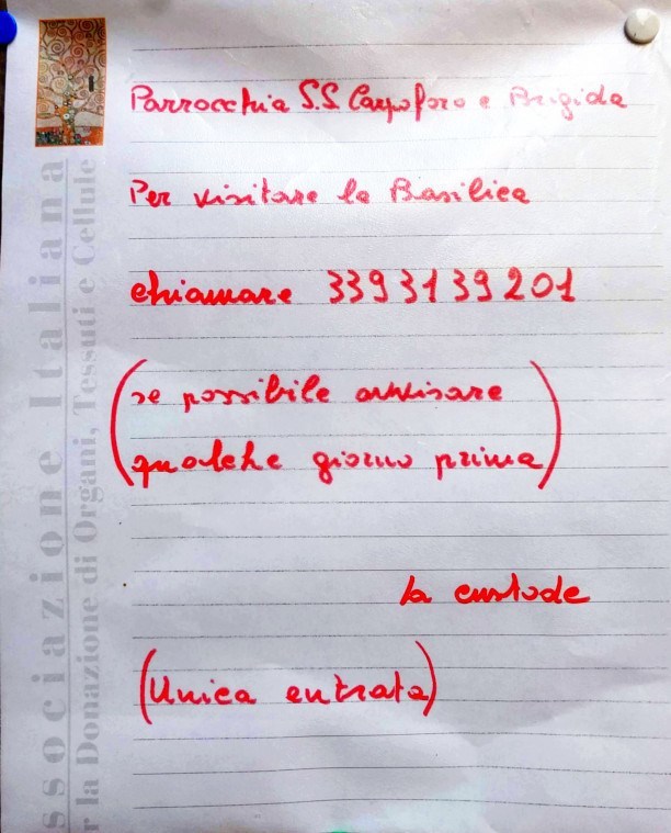 The church does not regularly host religious services, but is used by the nearby school. To visit the basilica, a notice (see below) at the entrance asks to contact the caretaker in advance.
