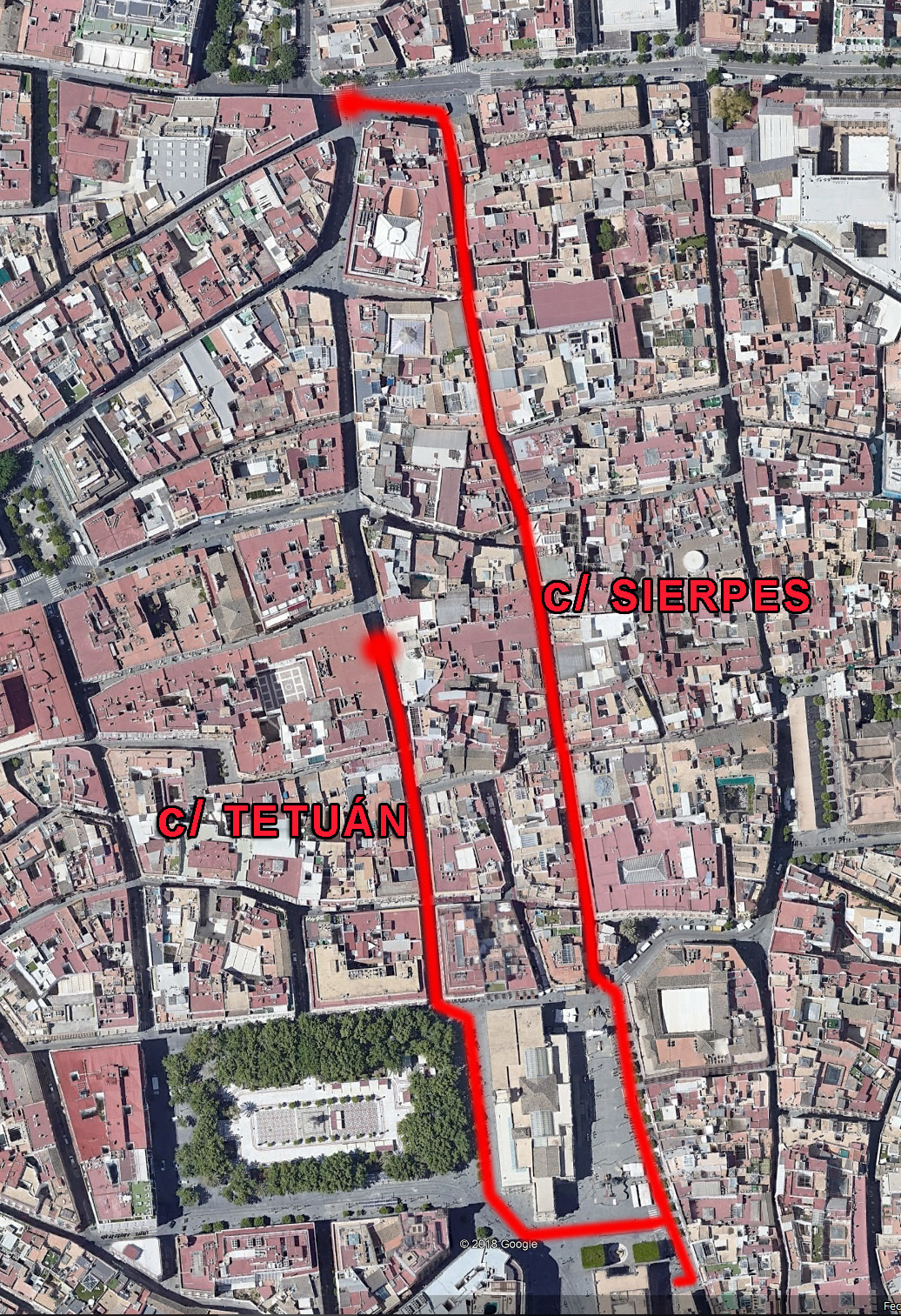 Walking area. I have chosen a route that starts at La Campana and runs through Sierpes Street to Plaza de San Francisco. Surrounding the City Hall, it returns along a section of Tetuán Street. Below you can see the map with the marked route. The letters are not in order so it is indifferent to take the walk in the opposite direction. But you will need to make the complete journey because at both ends there are necessary letters-words.