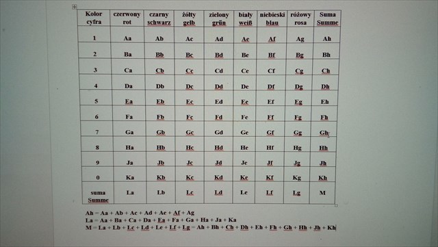 5. Umysł Helmuta pracował już na najwyąszych obrotach. Barman podstawił mu kolejny kufel. Helmut zaczął się zastanawiać: który to już dzisiaj ? Mózg zaczął przetwarzać dane i Helmut ujrzał wiele różnokolorowych cyfr. Aby to uporządkowac, stworzył tabelkę, gdzie zaczął notować ile widzi jedynek, dwójek . . . poszczególnych kolorów. I tak np. Aa to liczba czerwonych jedynek, Kd liczba zielonych zer, Fh - liczba wszystkich szóstek, Le - suma białych cyfr. (tabelka poniżej)