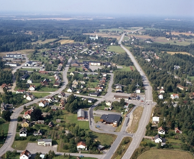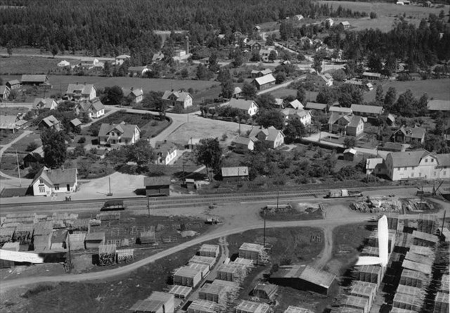 Denna något nyare bild visar Saxagårds industriområde, längst ut på den vänstra kanten. Jag är lite osäker på vilket år bilden är tagen. Det är efter att järnvägen lades ned, men innan äldreboendet byggdes. Förmodligen är det 1980-tal.