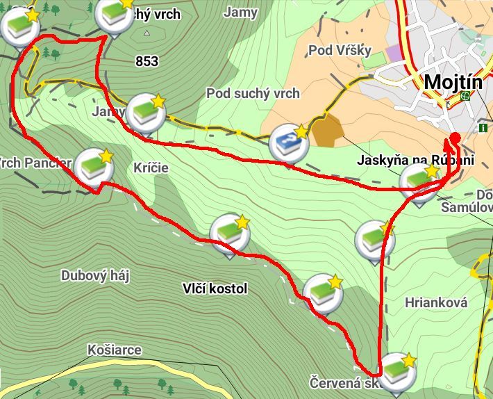 od č. 7 na č. 8: Trasa ešte zámerne neschádza na žltú značku smer Mojtín, ale pokračuje po lesnej ceste až na lúčku s kŕmidlom pod Suchým vrchom. To pre tých, čo by si radi obzreli aj tento vrchol. Je plný skalných útvarov, aj keď výhľad je veľmi obmedzený.