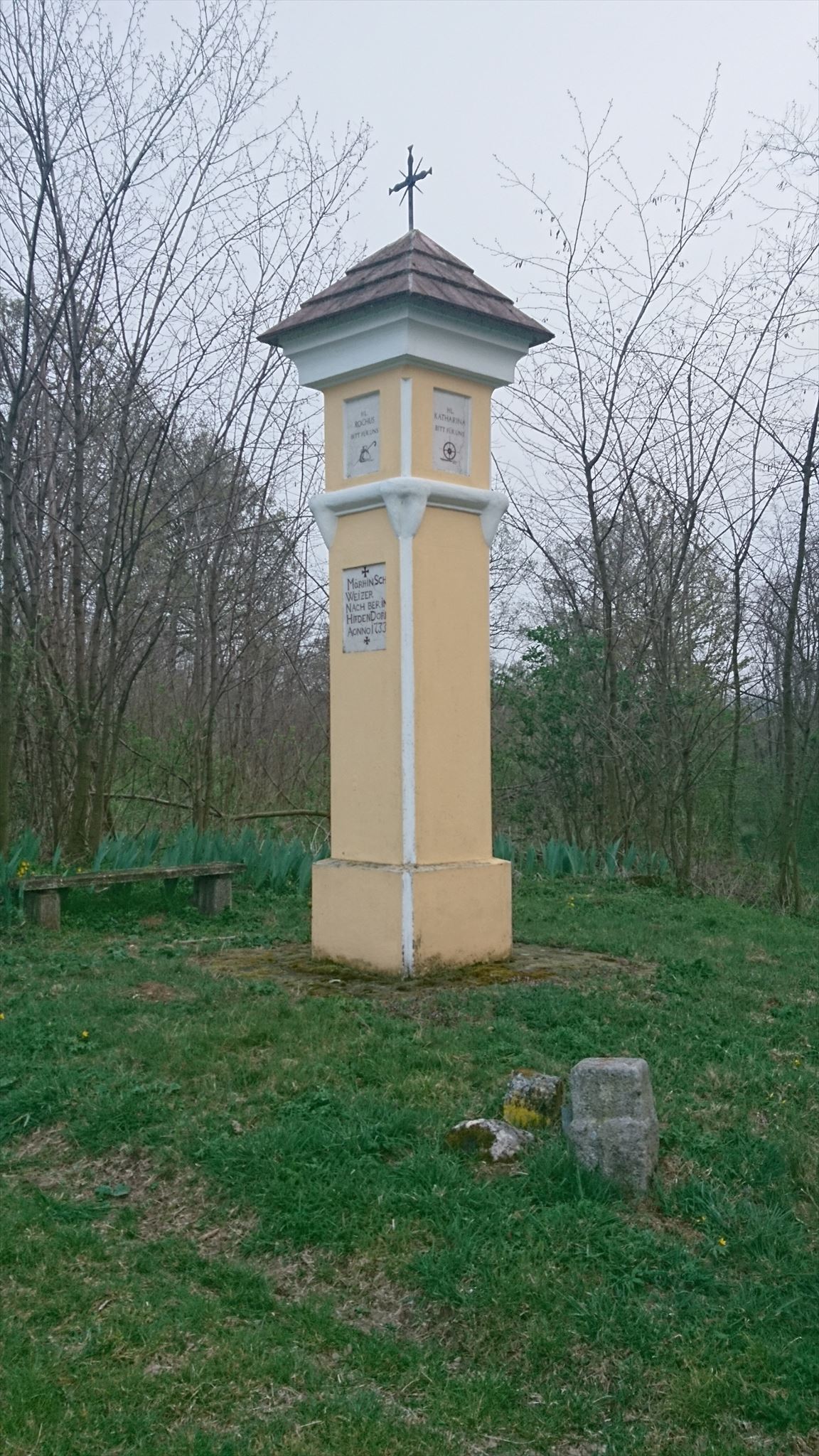 Während der Pest 1713 hatte sich ein Bauer aus Hüttendorf, namens Schweizer, mit seiner Tochter im Walde bei Asparn eine Hütte gebaut. Sie warteten dort, abgesondert von den anderen, das Erlöschen der Seuche ab. Zum Dank für die Errettung errichteten sie an jener Stelle einen Bildstock, der folgende Inschrift trägt: „MARTEIN SCHWEIZER MITNACHBAR IN HIRDENDORF AONNO 1733“.