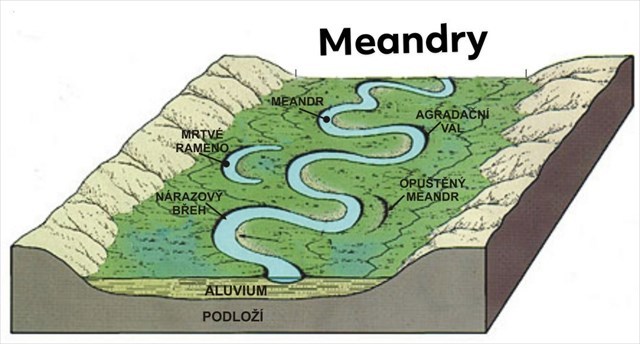 1) Na jaké typy se meandry dělí? S jakým typem se zde setkáváme?