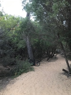 I placed this cache off this sandy path down a wallaby path to the Left as you come off the beach - ( now a geocacher's path as well). In the photo below is my mountain bike against the tree at the entrance to the wallaby path coming from the beach way. The dead end east end of Silverleaves Avenue is where this track starts to go to the beach - so the Wallaby way is to the Right of the track if you come this way.