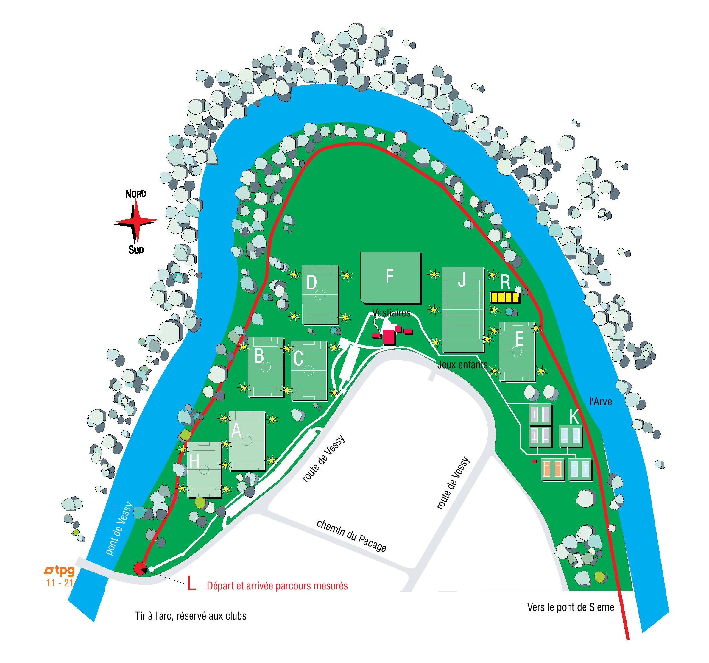 La particularité de ce centre sportif est d’accueillir un terrain de rugby et de football américain de compétition, de même, une piste de cross de 7.7 km et de 11.7 km, qui longe les bords de l’Arve jusqu’au bois de Veyrier, délimite le centre sportif.