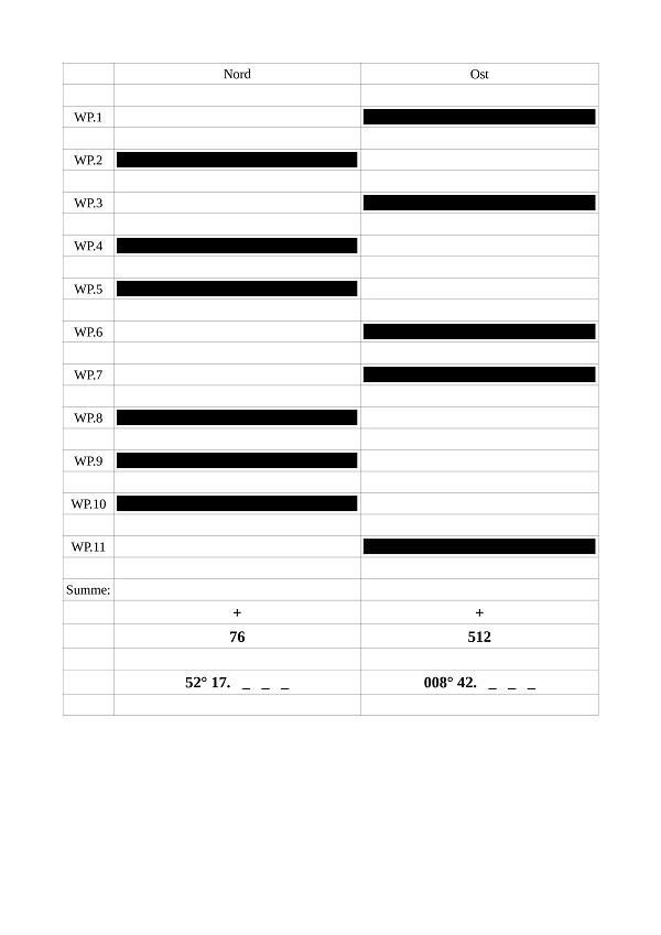 An den jeweiligen Stationen ( WayPoints ) tragt einfach die Variablen des dazugehörigen Fotoausschnitt in die Berechnung ein und am Ende der Runde sollten plausible Koordinaten auf Papier stehen.