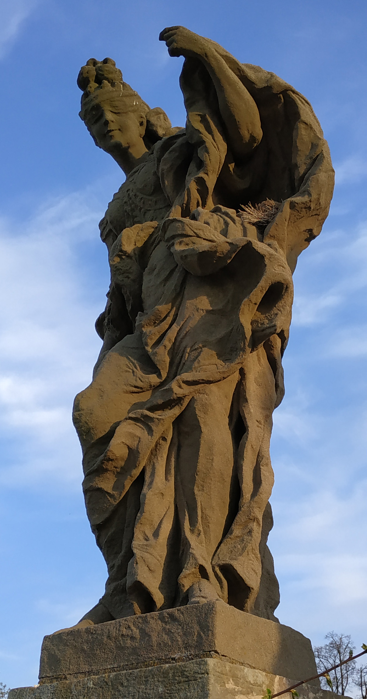 Žena, jejíž obličej má jemné rysy dítěte. V jejím něžném úsměvu je možné spatřit dokonce dolíčky. Její oči jsou překryty šátkem, to proto, aby spravedlivě soudila podle své moudrosti a svého srdce. Její pravá ruka se opírá o meč, který symbolizuje výkon spravedlnosti. V levé zdvižené ruce držela socha ještě váhy, které se bohužel nedochovaly a které jsou symbolem soudu, užívané k vážení dobra a zla, práva a bezpráví. Meč a váhy jsou atributy Spravedlnosti již od dob starého Říma. U levé ruky můžeme zpozorovat velmi nařasenou část nejspíše pláště, který jako kdyby se zvedal se samotnou rukou vzhůru. Její silueta je zvýrazněna jen v horní části a to zdobným korzetem, který spíše připomíná antické brnění.